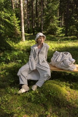 The clothes reflect shapes in nature: their stitching resembles the topographical map of the very same Finnish forest where the fibre itself originates, and the fringes along the edges bear a likeness to beard lichen. “Each piece is designed with versatility in mind. The sauna bag doubles as a seat, the skirt can be a towel, and the jacket works as a bathrobe,” says Virtanen.